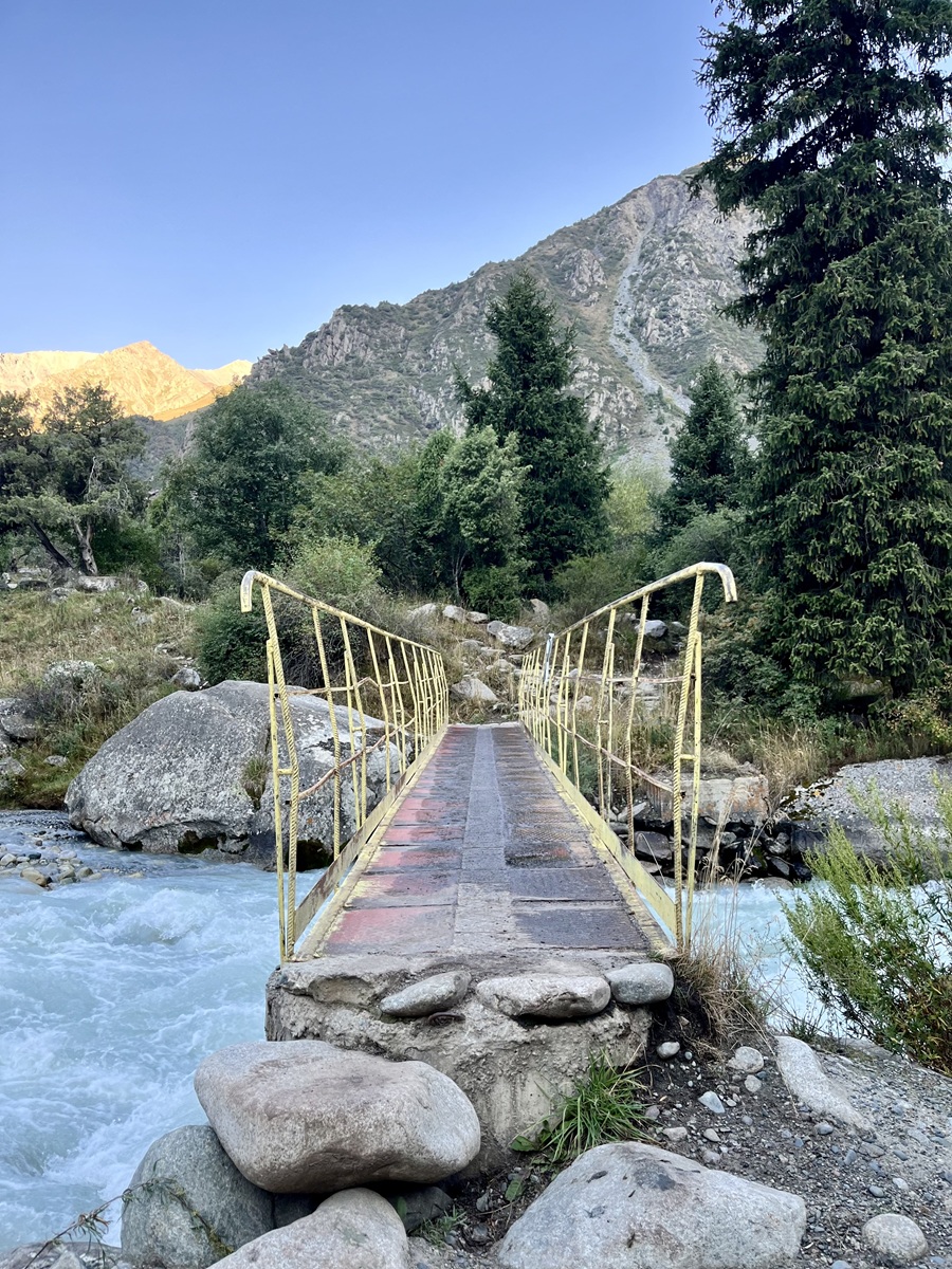 From the main road of Ala Archa National Park, the trail begins by crossing the Ala Archa River via the yellow bridge.