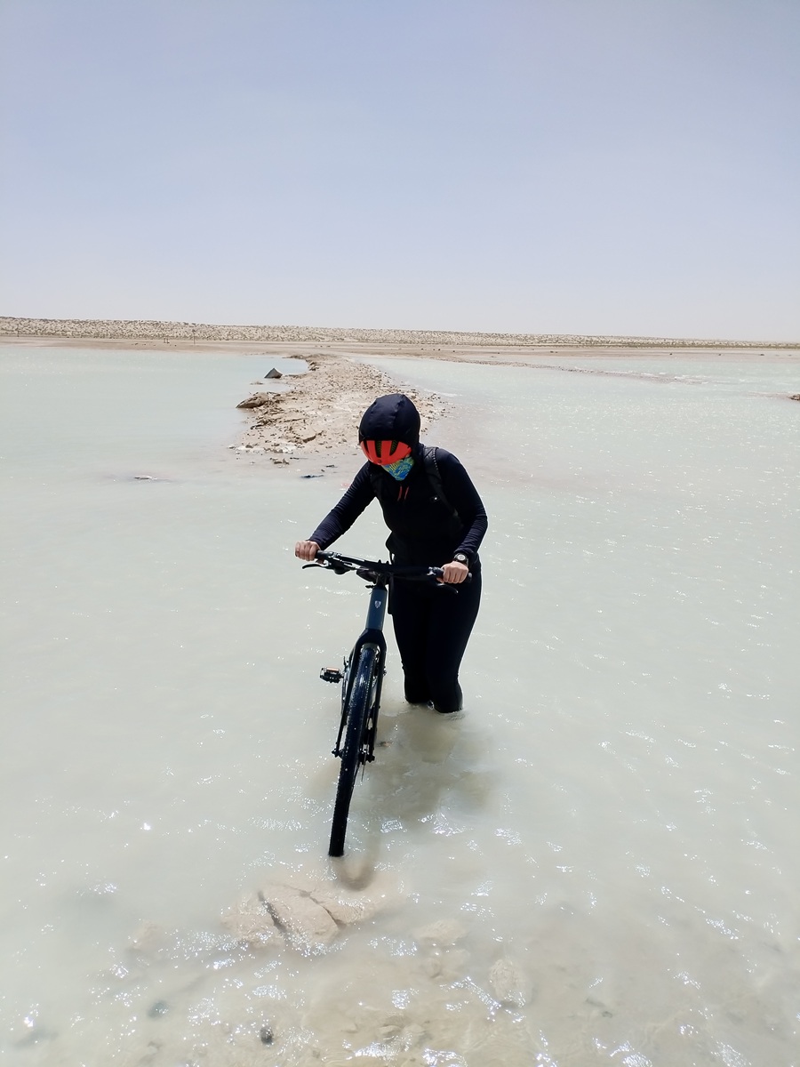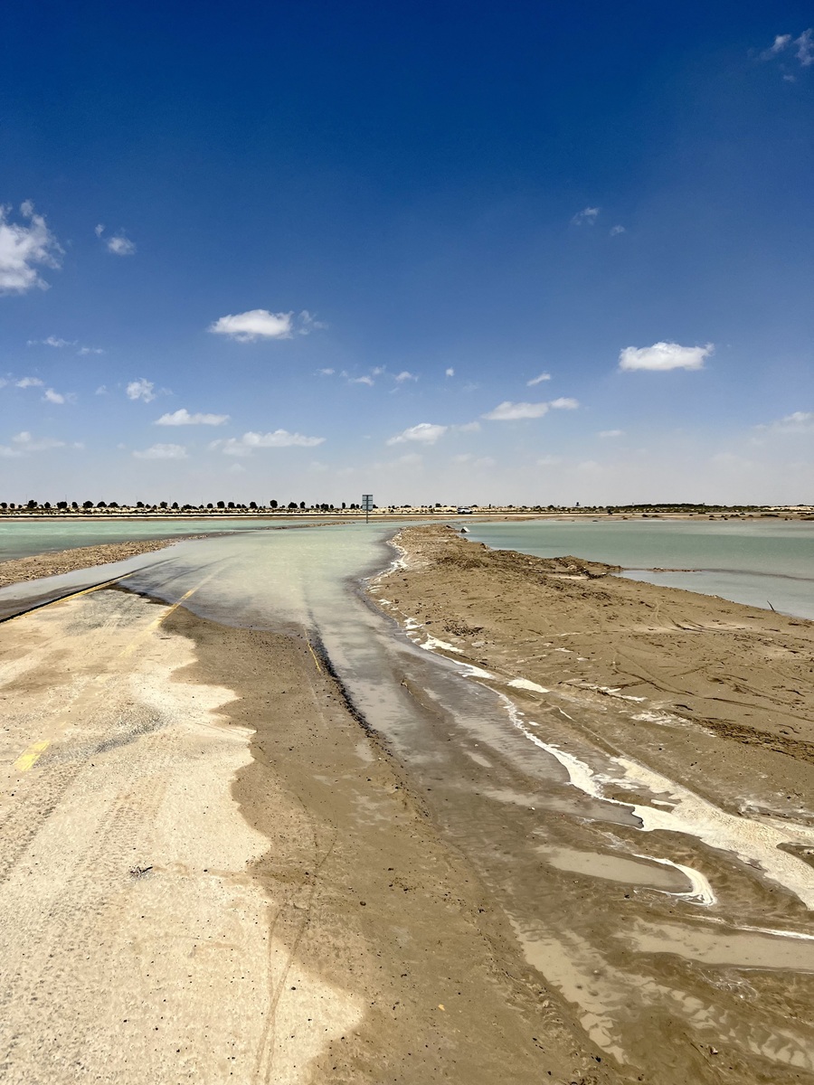 As we got closer, we realized the track itself was submerged. I was a bit nervous as cycling through it didn’t look predictable at all. We tried to find a way around it, but eventually had no choice but to get wet and cross it. Wet shoes and socks it is!