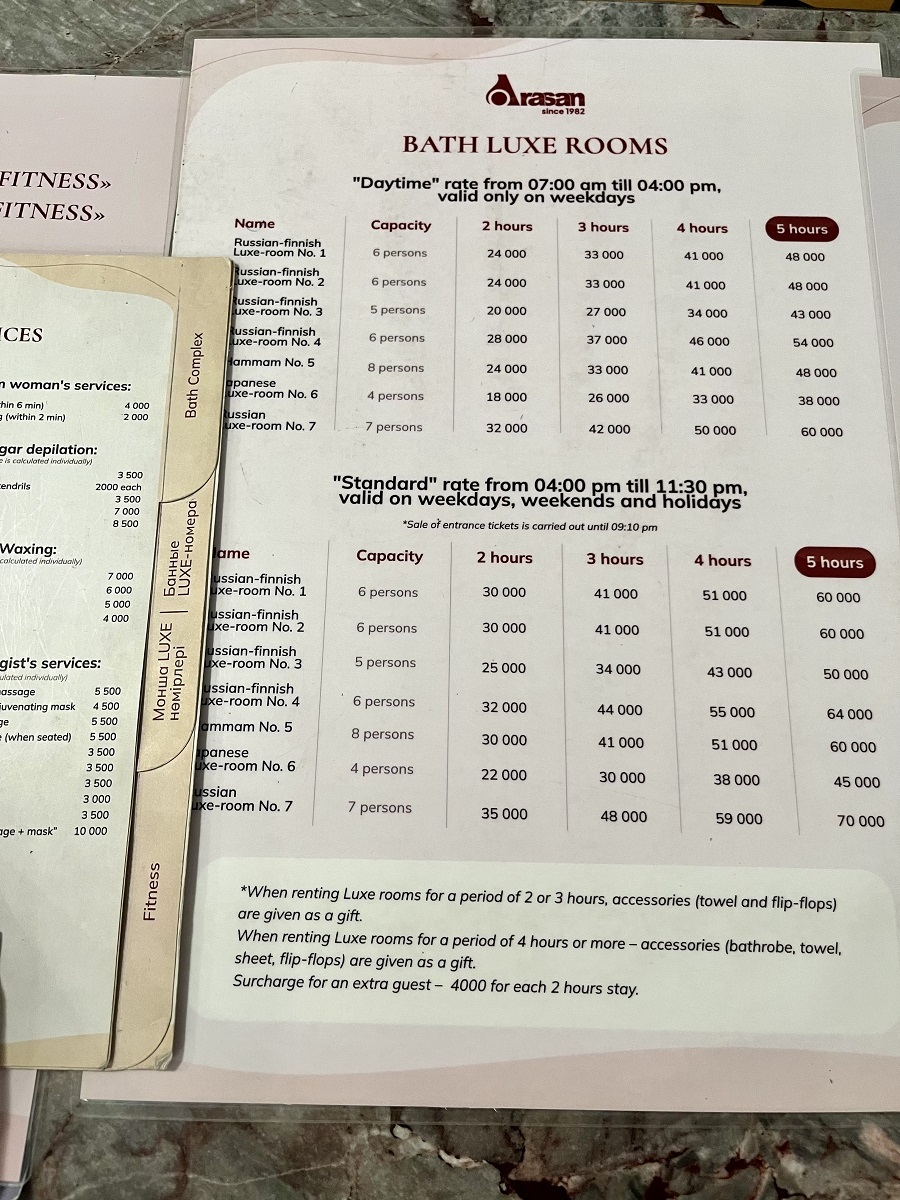 From 7:00 AM to 4:30 PM, the cost to enter Arasan Wellness & Spa in Almaty is 2,500 KZT for one hour. The later part of the day is more expensive which is 3,200 KZT for one hour. Here's the price list (as of June 2024) written in English for your reference: