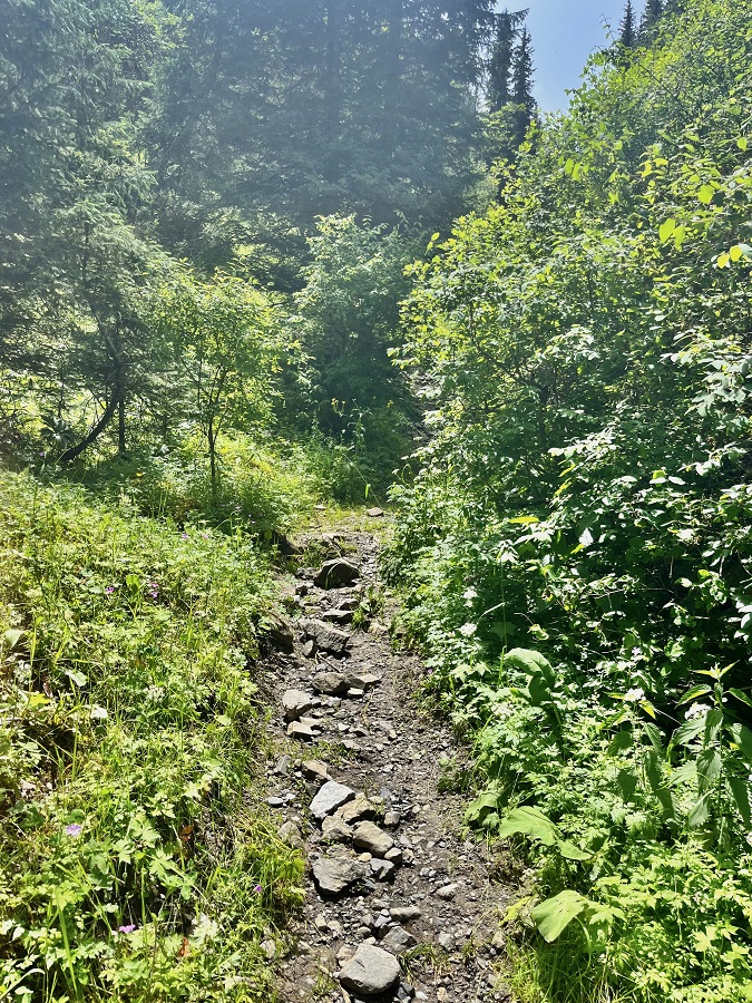 The horse trail that leads to the Kaindy Lake as seen from the hiking trail on the other side of the mountain