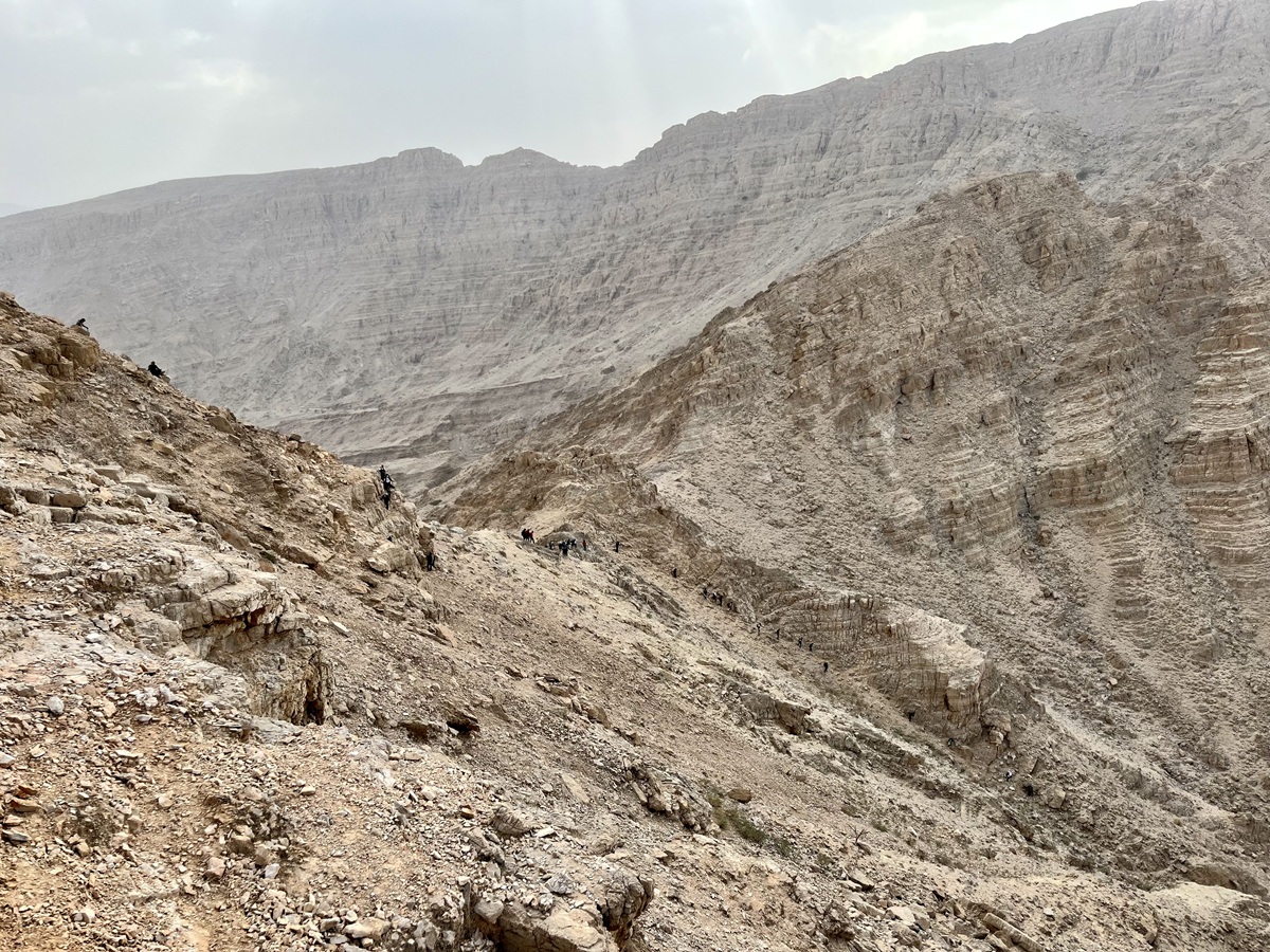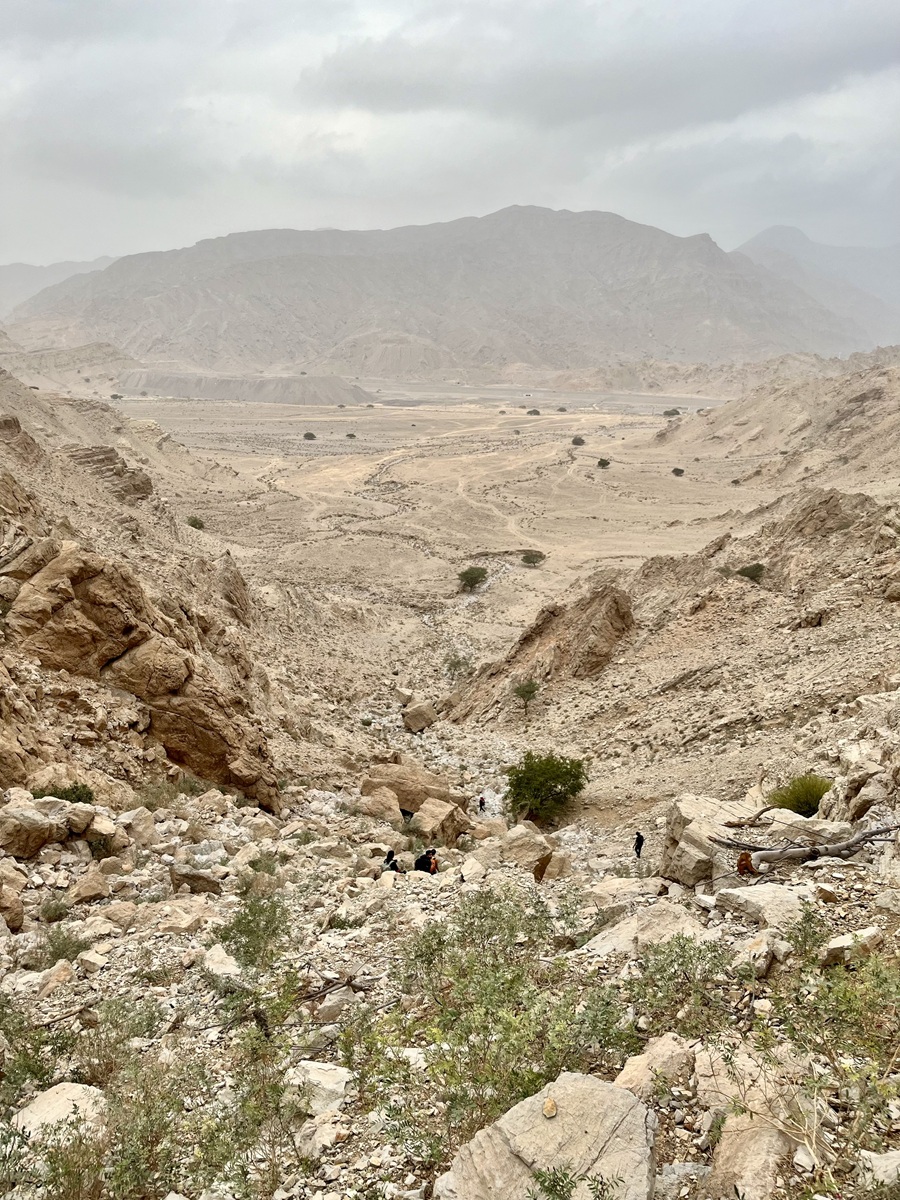Looking down at the wadi below us, the trail followed an inverted, invisible U-shaped route, gradually losing elevation as it led straight to the wadi.