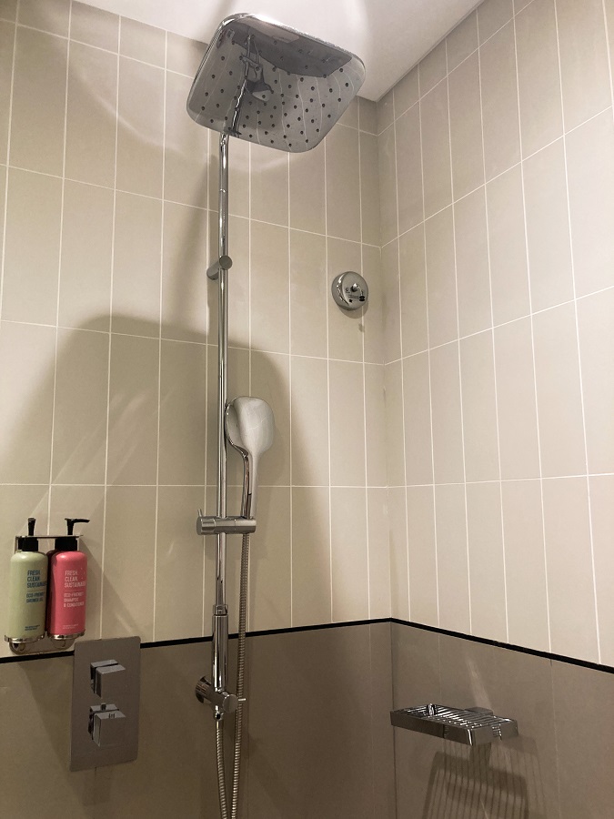 Decent and spacious size for a standard room, it comes with a mini-bar (though it's empty) and tea/coffee-making amenities, a squeaky clean bathroom and shower (no bath tub), and a weirdly-shaped balcony. The balcony is nice to have, I'm not a fan though. Not with its weird cut nor its angle and view.