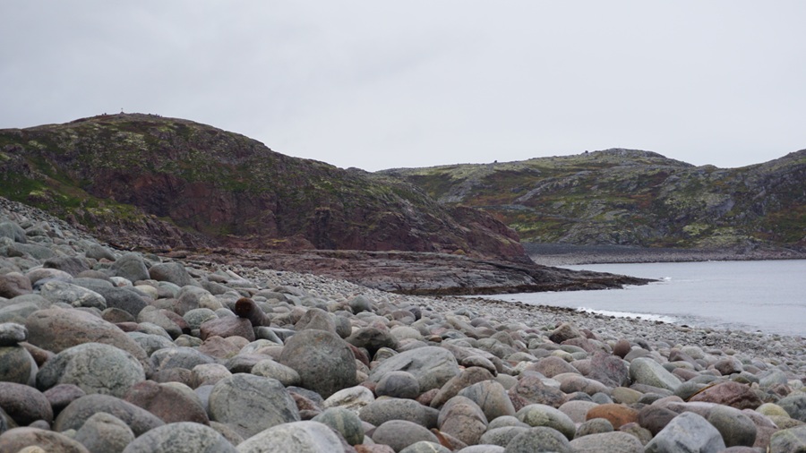 Another part of the tour was a 5-kilometer walk inside Teriberka's Natural Park. Inside the park, we were fully immersed in the Arctic landscape and one of its highlights was the "Beach of Dinosaur Eggs" named for its large, rounded stones that resembleโyou guessed itโdinosaur eggs.